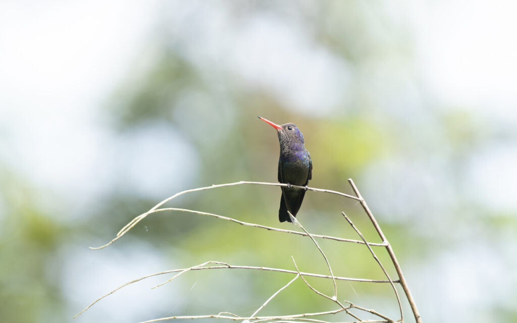 赤いクチバシ、そして複雑に輝く体色がが美しいハチドリです。湖沿いに突如現れ、縦横無尽に動き回り、カメラを一通りかく乱させた後に遠くの枝の上に留まってくれました。もっと近くでも観察してみたいです。